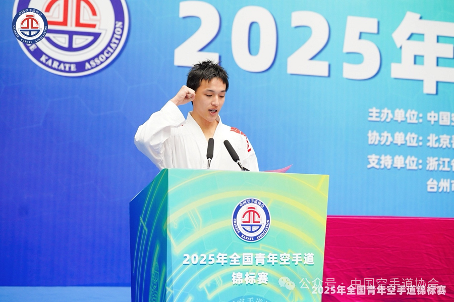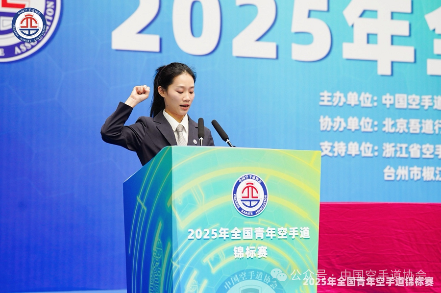 中国空手道协会副秘书长林靖在致辞中表示:全国青年空手道的佼佼者汇聚于台州,既是对“百折不挠、克己守礼”空手道精神的呼应,更是对台州“敢为天下先”精神的致敬。近年来,台州市高度重视体育事业发展,积极承办各类高水平体育赛事,为体育强国建设做出了积极贡献。台州为赛事提供了细致周到的服务保障,为全国青年空手道人搭建了追逐梦想的舞台。希望所有参与者共同维护“健康、文明、和谐”的赛会氛围,期待每一位选手在切磋和交流中领悟“以武修心”的境界,让这次赛会为推动空手道事业的持续发展、促进体育、文化的深度融合发挥积极作用。