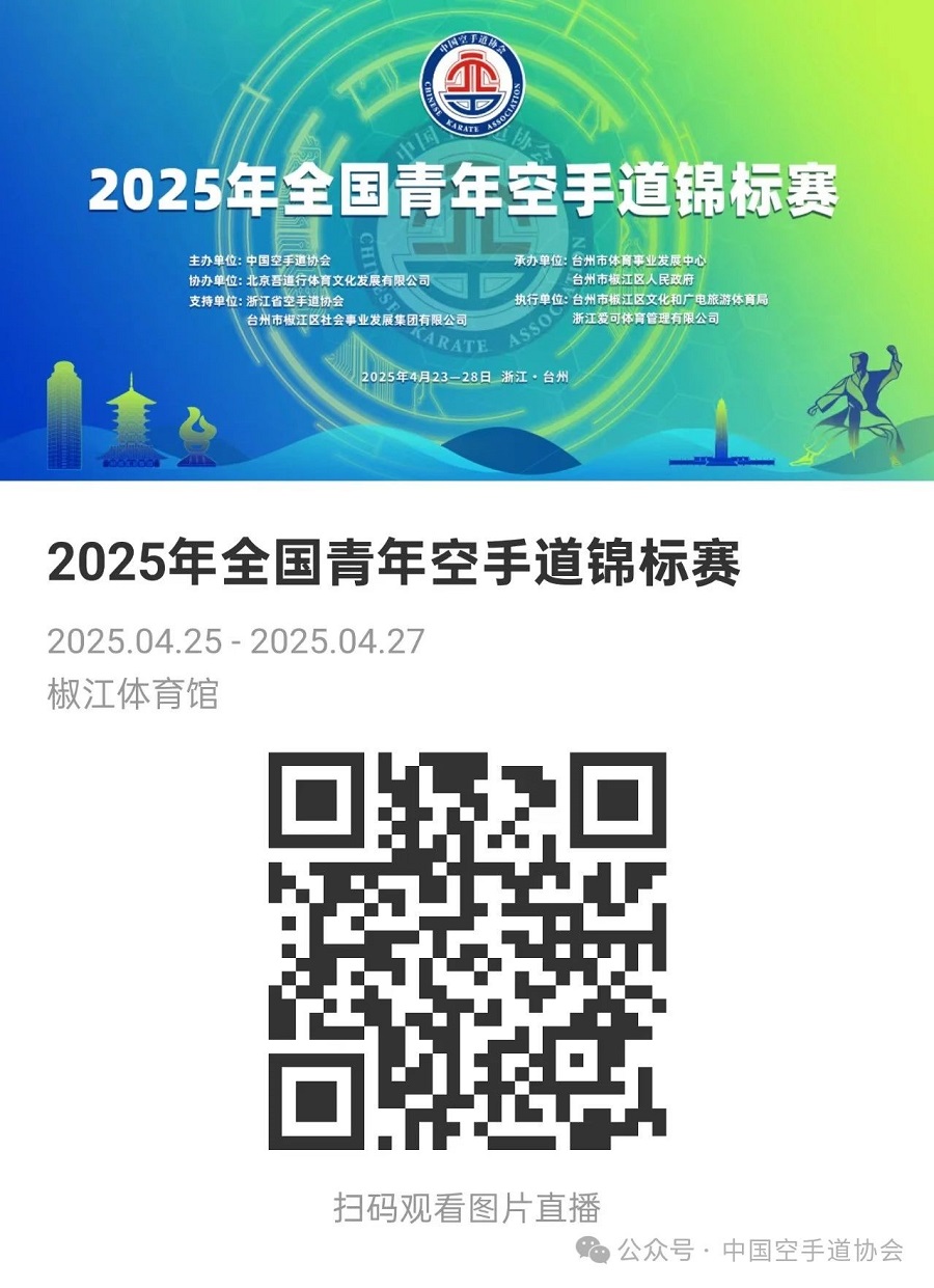 本次赛事由中国空手道协会主办,北京吾道行体育文化发展有限公司协办,浙江省空手道协会、台州市椒江区社会事业发展集团有限公司支持,台州市体育事业发展中心、台州市椒江区人民政府承办,台州市椒江区文化和广电旅游体育局、浙江爱可体育管理有限公司执行。 第一比赛日将决出男子-55kg、男子-68kg、女子个人型、女子团体型、女子-48kg共5个级别的金牌。 比赛全程在中国空手道协会官方视频号直播,扫描下方二维码可查看更多比赛图片。
